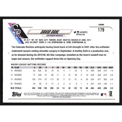 This is a 2021 Topps Chrome Sepia Refractors David Dahl baseball card. The card is #179 and pictures show condition.