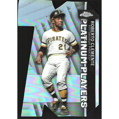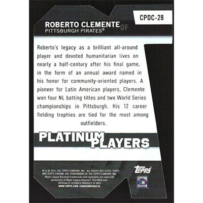 This is a 2021 Topps Chrome Update Platinum Player Die Cuts Roberto Clemente baseball card. The card is #CPDC-28 and pictures show condition. Team(s): Pittsburgh Pirates