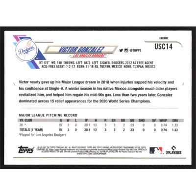 This is a 2021 Topps Chrome Update Purple Refractors Victor Gonzalez baseball card. The card is #USC14 and pictures show condition. Team(s): Los Angeles Dodgers Rookie Card (RC)