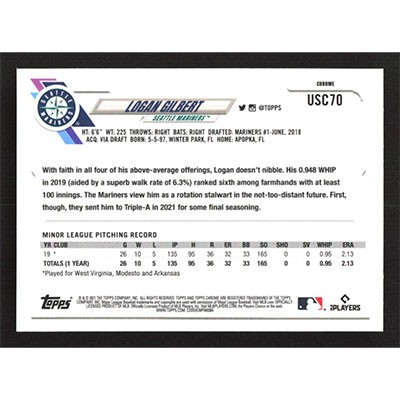 This is a 2021 Topps Chrome Update Purple Refractors Logan Gilbert baseball card. The card is #USC70 and pictures show condition.