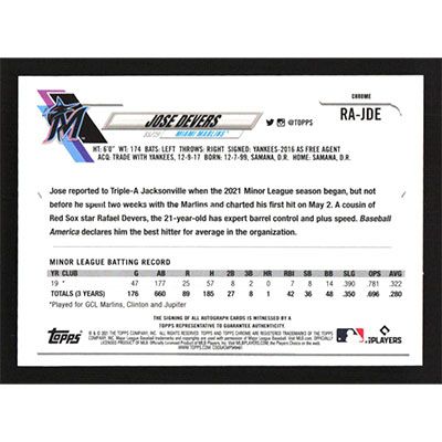 This is a 2021 Topps Chrome Update Sapphire Rookie Autographs Jose Devers autographed baseball card. This card has been signed, in blue, by Jose Devers, and is certified authentic by Topps. The card is #RA-JDE and pictures show condition.