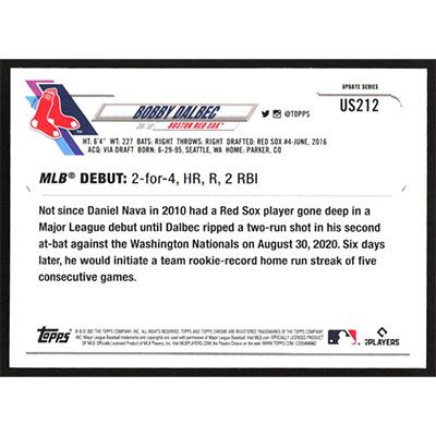 This is a 2021 Topps Chrome Update Sapphire Bobby Dalbec Rookie Debut baseball card. The card is #US212 and pictures show condition. Team(s): Boston Red Sox Rookie Card (RC)