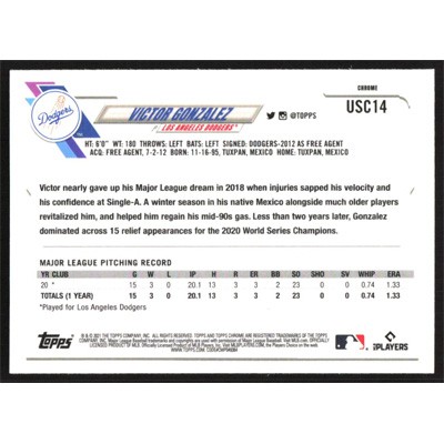 This is a 2021 Topps Chrome Update Victor Gonzalez baseball card. The card is #USC14 and pictures show condition. Team(s): Los Angeles Dodgers Rookie Card (RC)