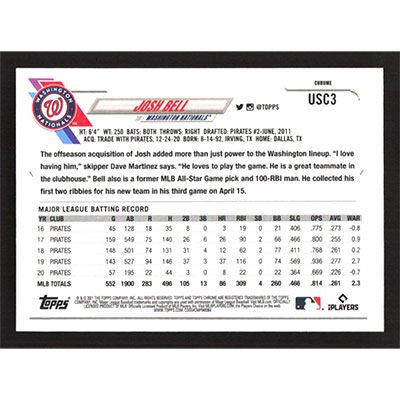 This is a 2021 Topps Chrome Update Josh Bell baseball card. The card is #USC3 and pictures show condition.