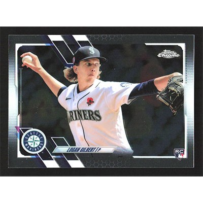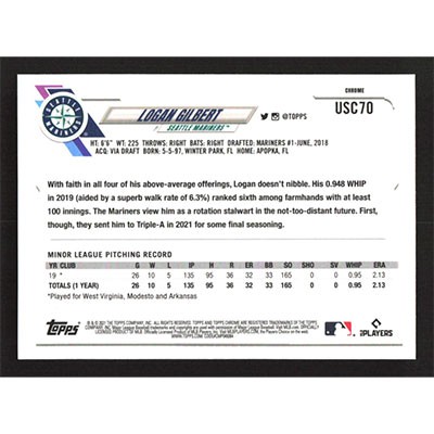 This is a 2021 Topps Chrome Update Logan Gilbert baseball card. The card is #USC70 and pictures show condition.
