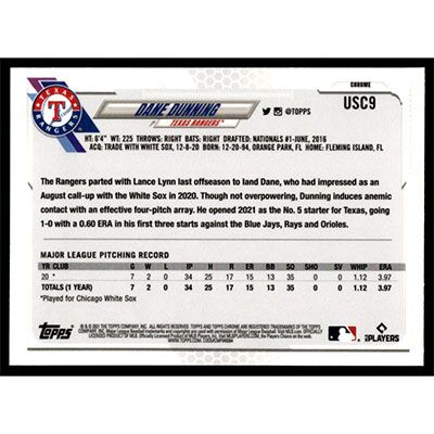 This is a 2021 Topps Chrome Update Dane Dunning baseball card. The card is #USC9 and pictures show condition.