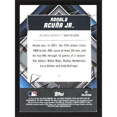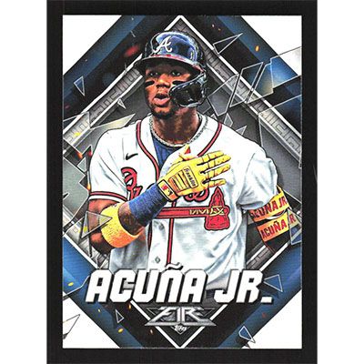 This is a 2021 Topps Fire Ronald Acuña Jr. baseball card. The card is #1 and pictures show condition.