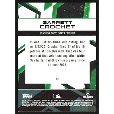 This is a 2021 Topps Fire Garrett Crochet baseball card. The card is #10 and pictures show condition.