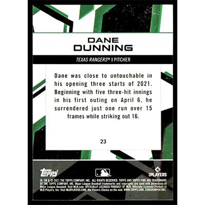 This is a 2021 Topps Fire Dane Dunning baseball card. The card is #23 and pictures show condition.