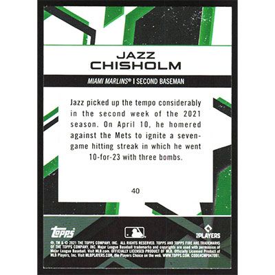 This is a 2021 Topps Fire Jazz Chisholm baseball card. The card is #40 and pictures show condition.