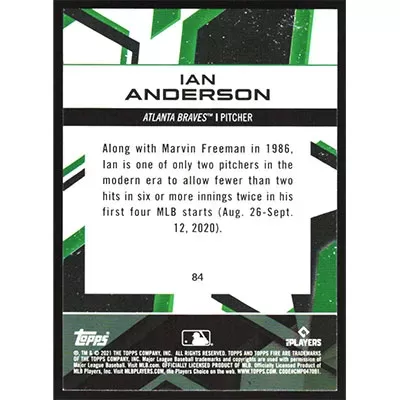 This is a 2021 Topps Fire Ian Anderson baseball card. The card is #84 and pictures show condition.