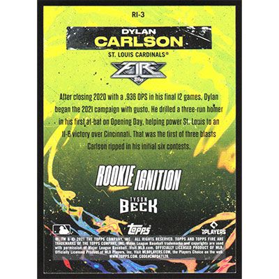 This is a 2021 Topps Fire Rookie Ignition Gold Minted Dylan Carlson baseball card. The card is #RI-3 and pictures show condition. Team(s): St. Louis Cardinals Rookie Card (RC)
