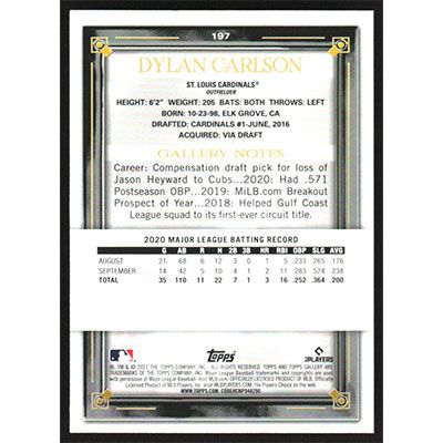 This is a 2021 Topps Gallery Dylan Carlson baseball card. The card is #197 and pictures show condition. Team(s): St. Louis Cardinals Rookie Card (RC)