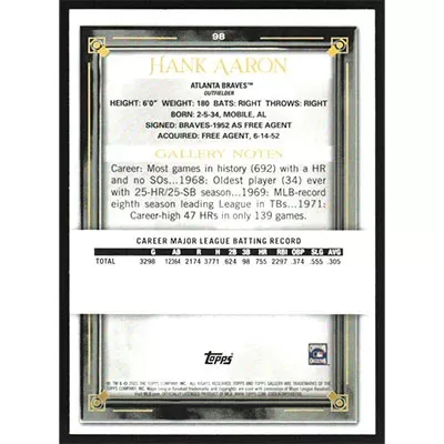 This is a 2021 Topps Gallery Hank Aaron baseball card. The card is #98 and pictures show condition.