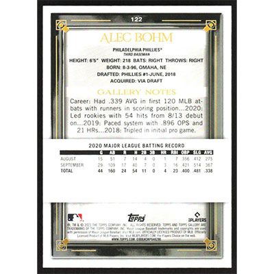 This is a 2021 Topps Gallery Rainbow Foil Alec Bohm baseball card. The card is #122 and pictures show condition. Team(s): Philadelphia Phillies Rookie Card (RC)