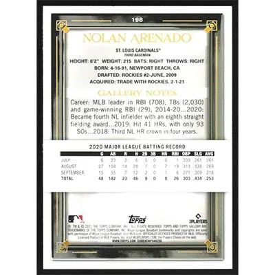 This is a 2021 Topps Gallery Rainbow Foil Nolan Arenado baseball card. The card is #198 and pictures show condition.
