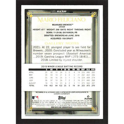 This is a 2021 Topps Gallery Rookie Autographs Mario Feliciano autographed baseball card. This card has been signed, in blue, by Mario Feliciano, and is certified authentic by Topps. The card is #RA-MF and pictures show condition.