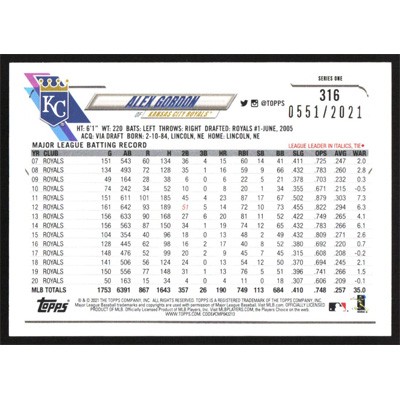 This is a 2021 Topps Gold Alex Gordon baseball card. The card is #316 and pictures show condition. This card is limited; #'d 0551/2021.