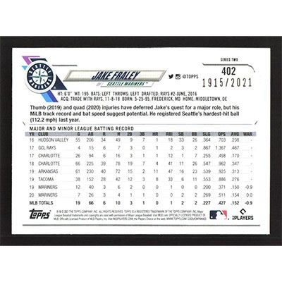 This is a 2021 Topps Gold Jake Fraley baseball card. The card is #402 and pictures show condition. This card is limited; #'d 1915/2021. Team(s): Seattle Mariners