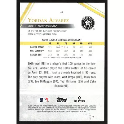 This is a 2021 Topps Gold Label Class 1 Yordan Alvarez baseball card. The card is #45 and pictures show condition.