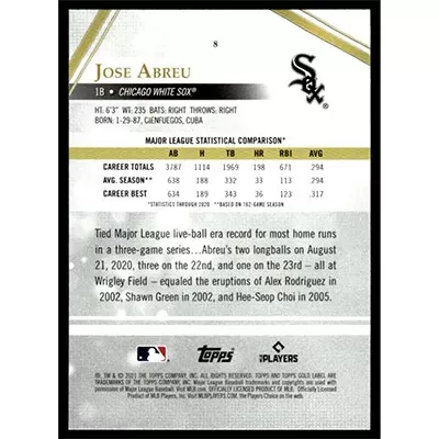 This is a 2021 Topps Gold Label Class 1 Jose Abreu baseball card. The card is #8 and pictures show condition.