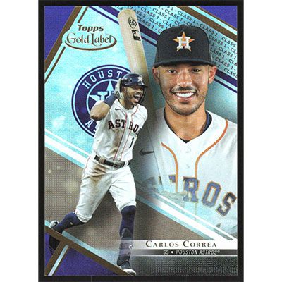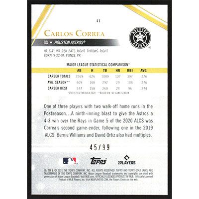 This is a 2021 Topps Gold Label Class 1 Purple Carlos Correa baseball card. The card is #41 and pictures show condition. This card is limited; #'d 45/99.