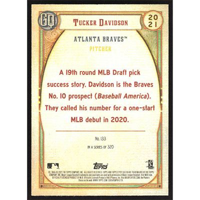 This is a 2021 Topps Gypsy Queen Tucker Davidson baseball card. The card is #133 and pictures show condition. Team(s): Atlanta Braves Rookie Card (RC)