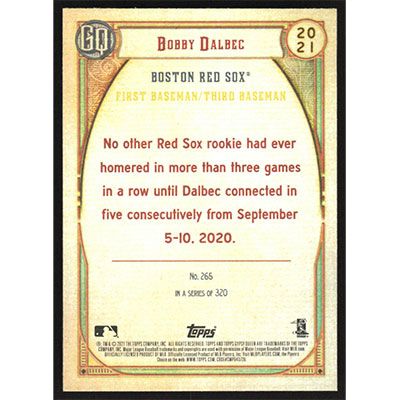 This is a 2021 Topps Gypsy Queen Bobby Dalbec baseball card. The card is #265 and pictures show condition.