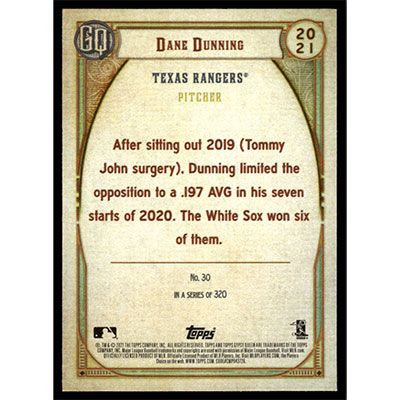This is a 2021 Topps Gypsy Queen Dane Dunning baseball card. The card is #30 and pictures show condition.