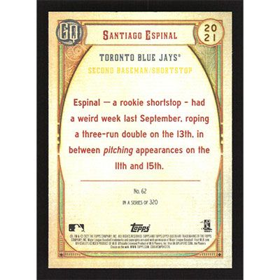 This is a 2021 Topps Gypsy Queen Santiago Espinal baseball card. The card is #62 and pictures show condition. Team(s): Toronto Blue Jays Rookie Card (RC)