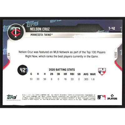 This is a 2021 Topps Now MLB Network Top 100 Nelson Cruz baseball card. The card is #T-42 and pictures show condition.