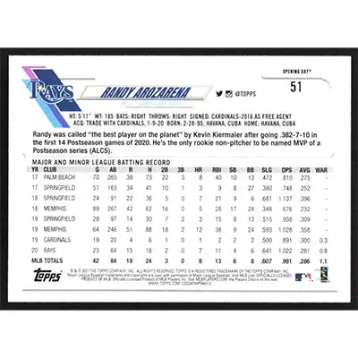 This is a 2021 Topps Opening Day Randy Arozarena Future Stars baseball card. The card is #51 and pictures show condition.