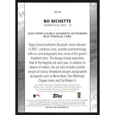 This is a 2021 Topps Through the Years Bo Bichette baseball card. The card is #TTY-30 and pictures show condition.