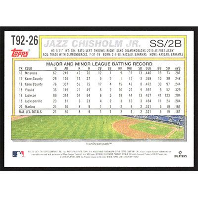 This is a 2021 Topps Update '92 Redux Jazz Chisholm Jr. baseball card. The card is #T92-26 and pictures show condition. Team(s): Miami Marlins Rookie Card (RC)