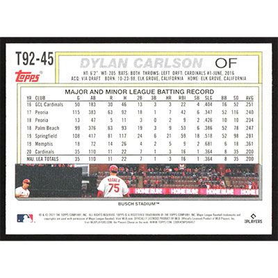 This is a 2021 Topps Update '92 Redux Dylan Carlson baseball card. The card is #T92-45 and pictures show condition. Team(s): St. Louis Cardinals Rookie Card (RC)