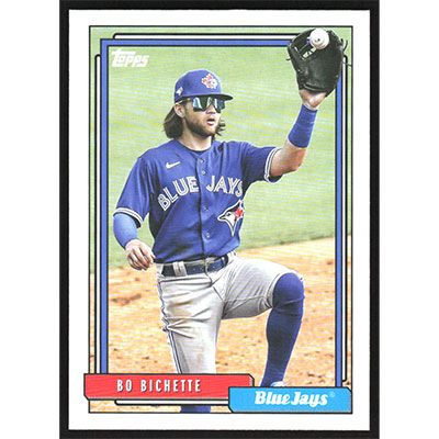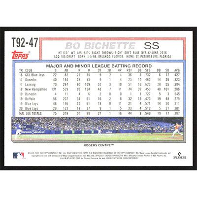 This is a 2021 Topps Update '92 Redux Bo Bichette baseball card. The card is #T92-47 and pictures show condition.