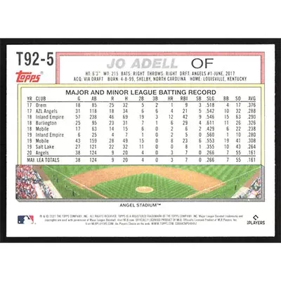 This is a 2021 Topps Update '92 Redux Jo Adell baseball card. The card is #T92-5 and pictures show condition.
