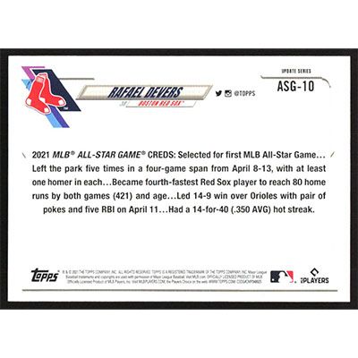 This is a 2021 Topps Update MLB All-Stars Rafael Devers baseball card. The card is #ASG-10 and pictures show condition.