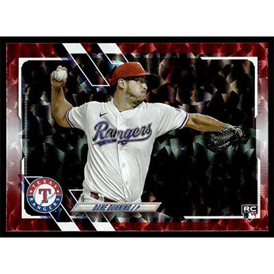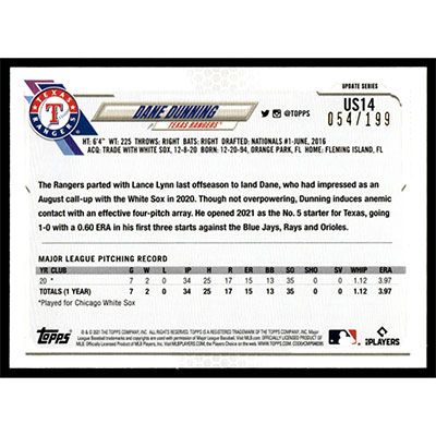 This is a 2021 Topps Update Red Foilboard Dane Dunning baseball card. The card is #US14 and pictures show condition. This card is limited; #'d 054/199.