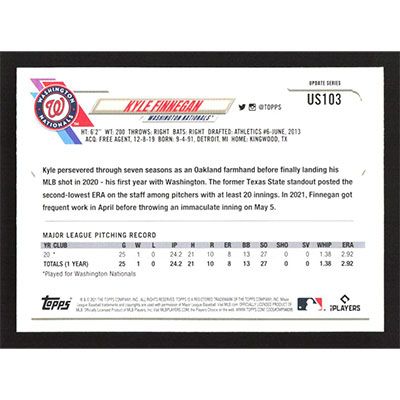 This is a 2021 Topps Update Kyle Finnegan baseball card. The card is #US103 and pictures show condition. Team(s): Washington Nationals Rookie Card (RC)