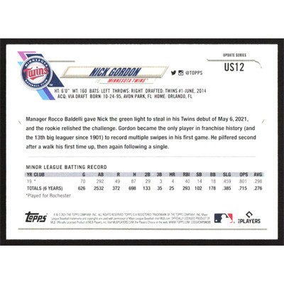 This is a 2021 Topps Update Nick Gordon baseball card. The card is #US12 and pictures show condition.