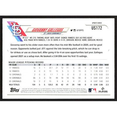 This is a 2021 Topps Update Giovanny Gallegos baseball card. The card is #US172 and pictures show condition.