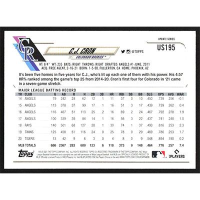 This is a 2021 Topps Update C.J. Cron baseball card. The card is #US195 and pictures show condition.