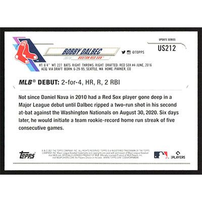 This is a 2021 Topps Update Bobby Dalbec Rookie Debut baseball card. The card is #US212 and pictures show condition. Team(s): Boston Red Sox Rookie Card (RC)