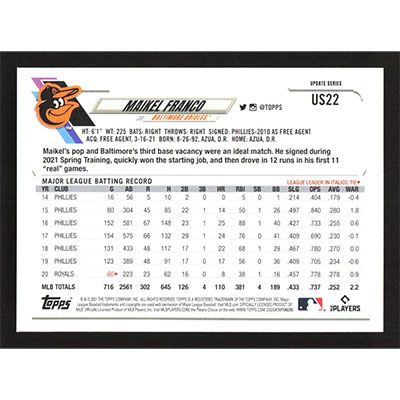 This is a 2021 Topps Update Maikel Franco baseball card. The card is #US22 and pictures show condition.
