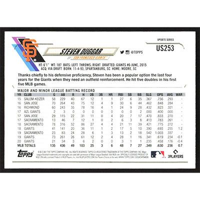This is a 2021 Topps Update Steven Duggar baseball card. The card is #US253 and pictures show condition.