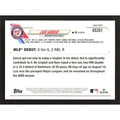 This is a 2021 Topps Update Luis Garcia Rookie Debut baseball card. The card is #US261 and pictures show condition. Team(s): Washington Nationals Rookie Card (RC)