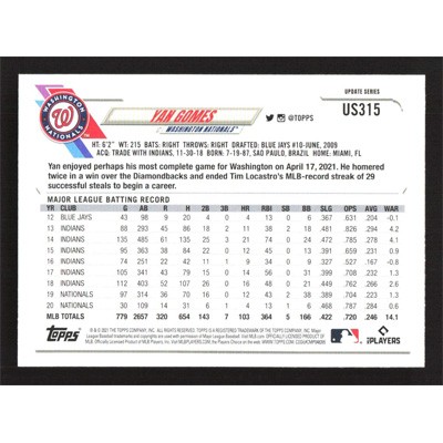 This is a 2021 Topps Update Yan Gomes baseball card. The card is #US315 and pictures show condition.