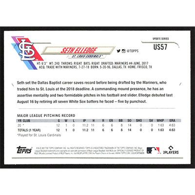 This is a 2021 Topps Update Seth Elledge baseball card. The card is #US57 and pictures show condition. Team(s): St. Louis Cardinals Rookie Card (RC)