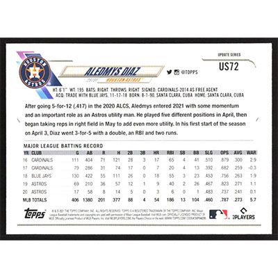 This is a 2021 Topps Update Aledmys Diaz baseball card. The card is #US72 and pictures show condition.
